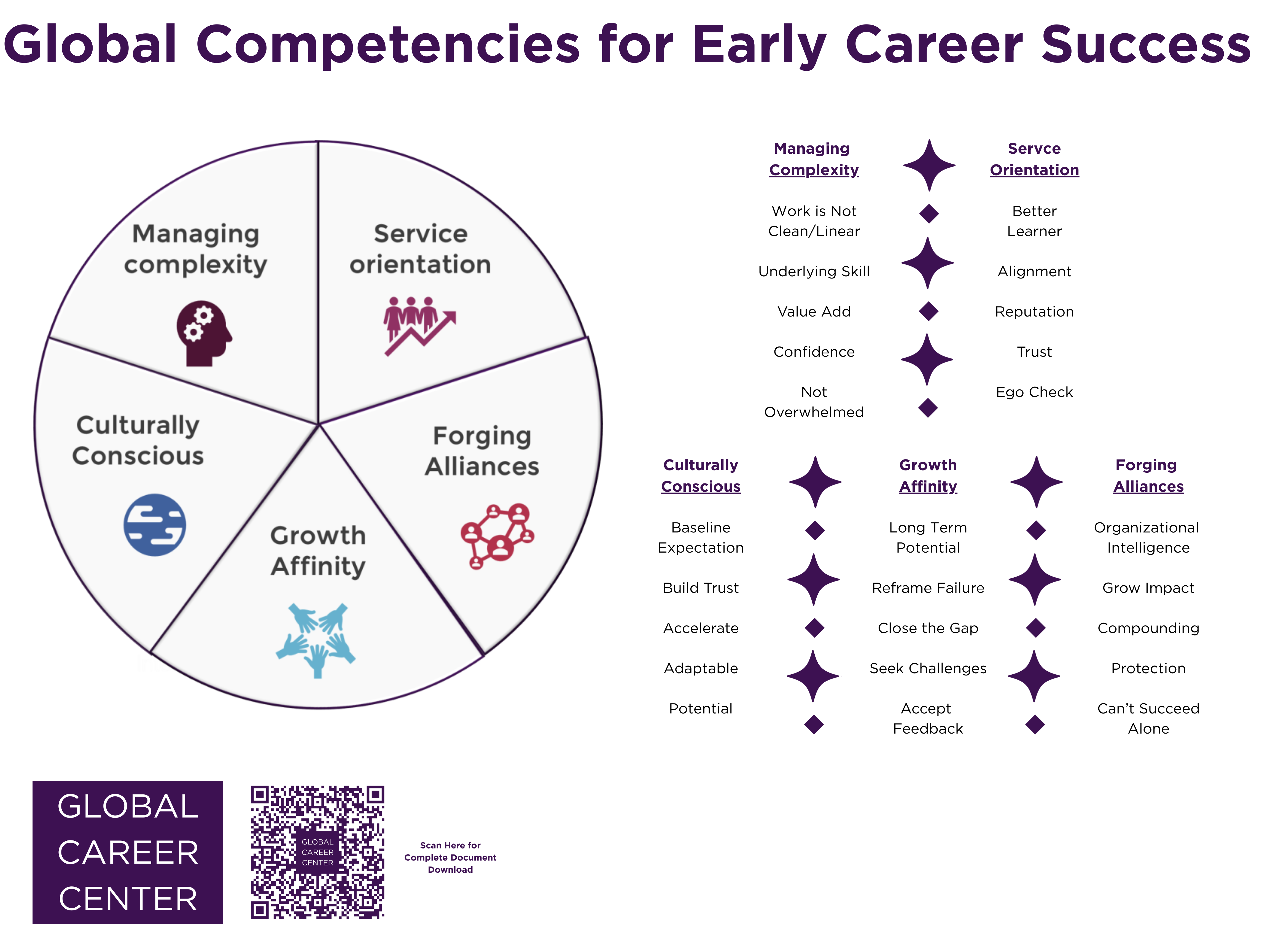The principles of the model are that it is stakeholder driven, holistic, and interconnected. The team identified 5 main clusters that capture the key drivers for success of early-career professionals: Managing Complexity, Service Orientation, Culturally Conscious, Growth Affinity, and Forging Alliances. Each cluster is further defined by key skills and demonstrated behaviors. Download the full PDF version here.
